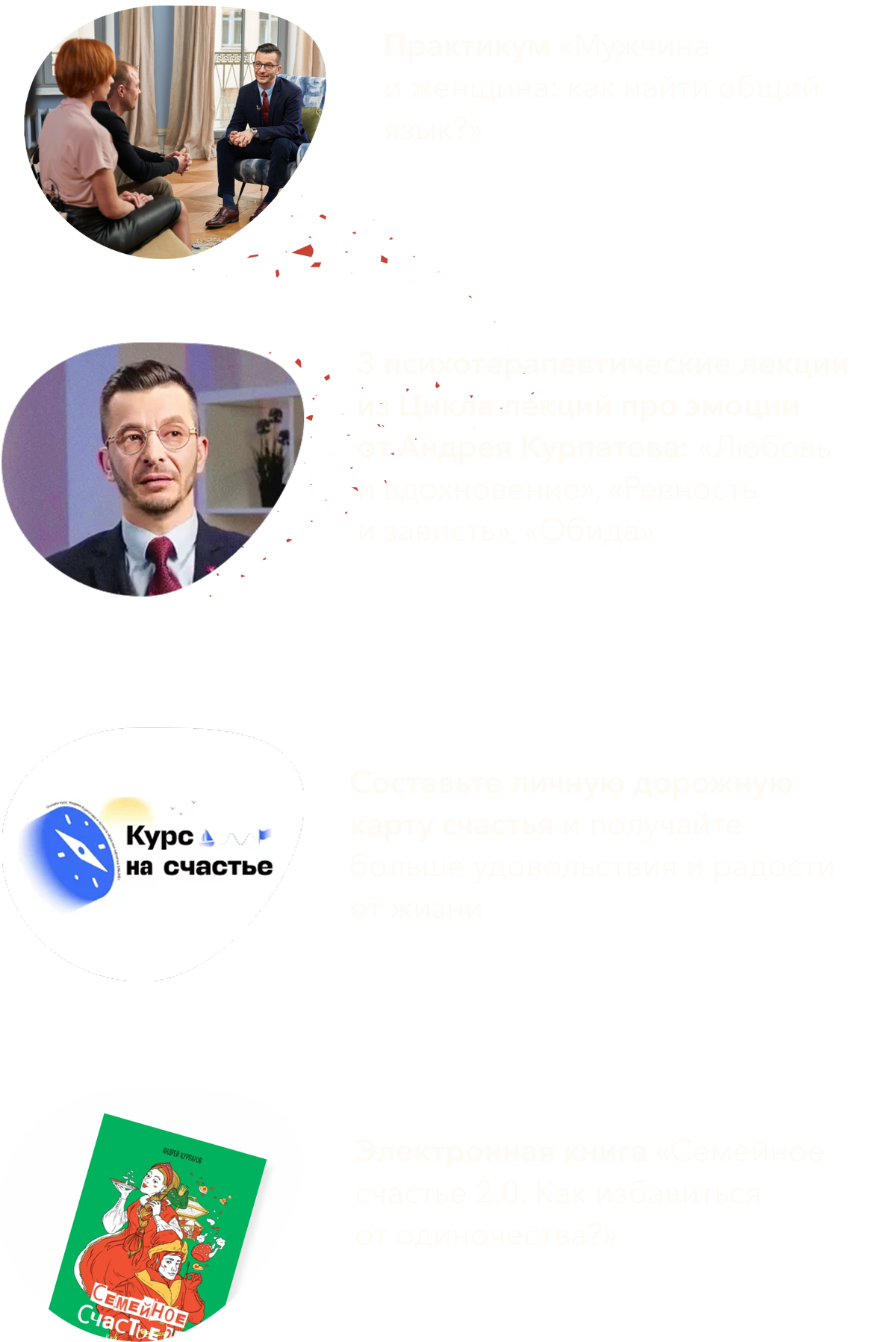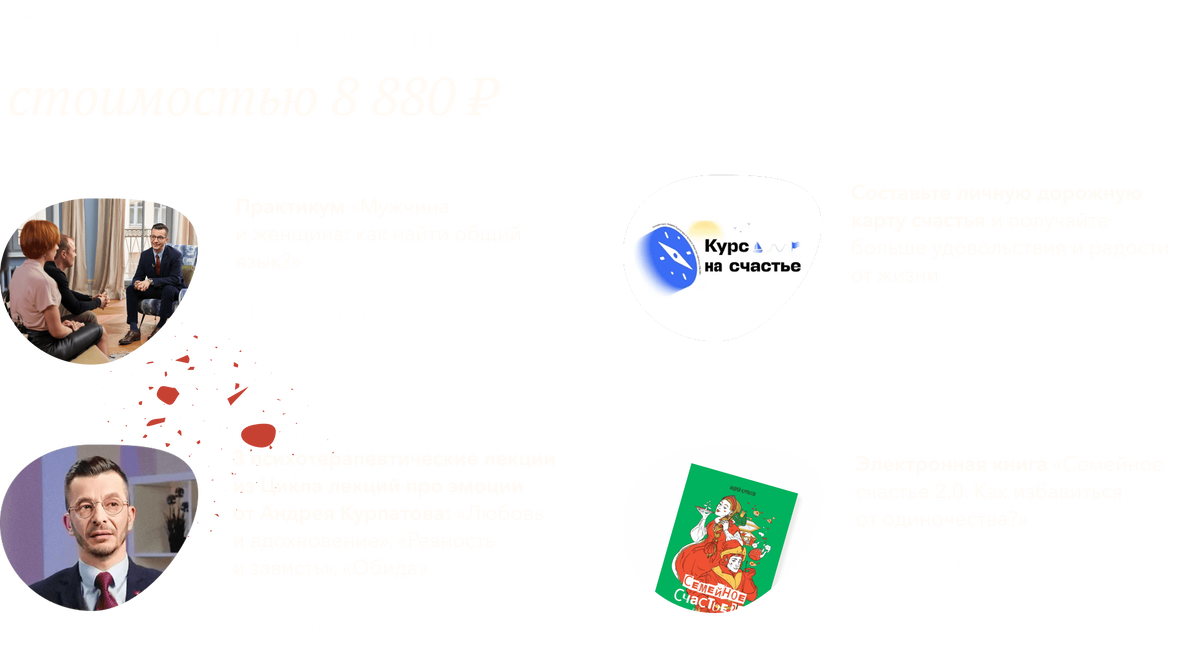 - Его курсы по практической психологии прошли уже десятки тысяч людей — программы помогают справиться с тревогой и паническими атаками, депрессивными состояниями и фобиями, нормализовать вес, наладить отношения в семье и с детьми.