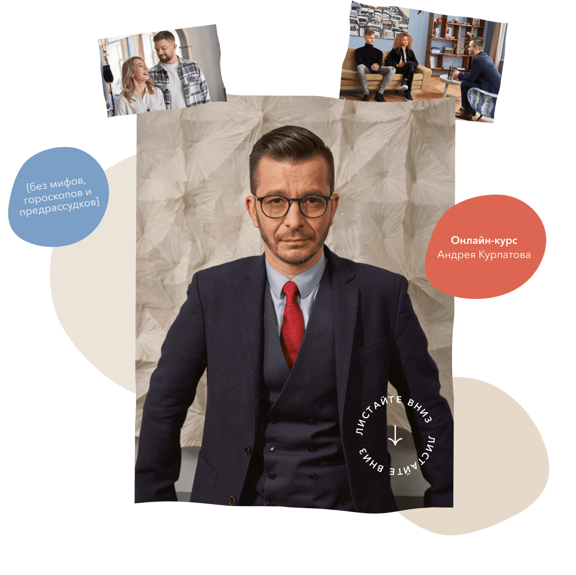 Андрей Курпатов — автор программы курса и соведущий. Специально для курса «М+Ж. Психология отношений» он записал несколько часов эксклюзивного материала, который вы сможете посмотреть только на курсе. Так же он провел разборы кейсов героев курса: пар и одиноких людей, сталкивающихся с разного рода проблемами.