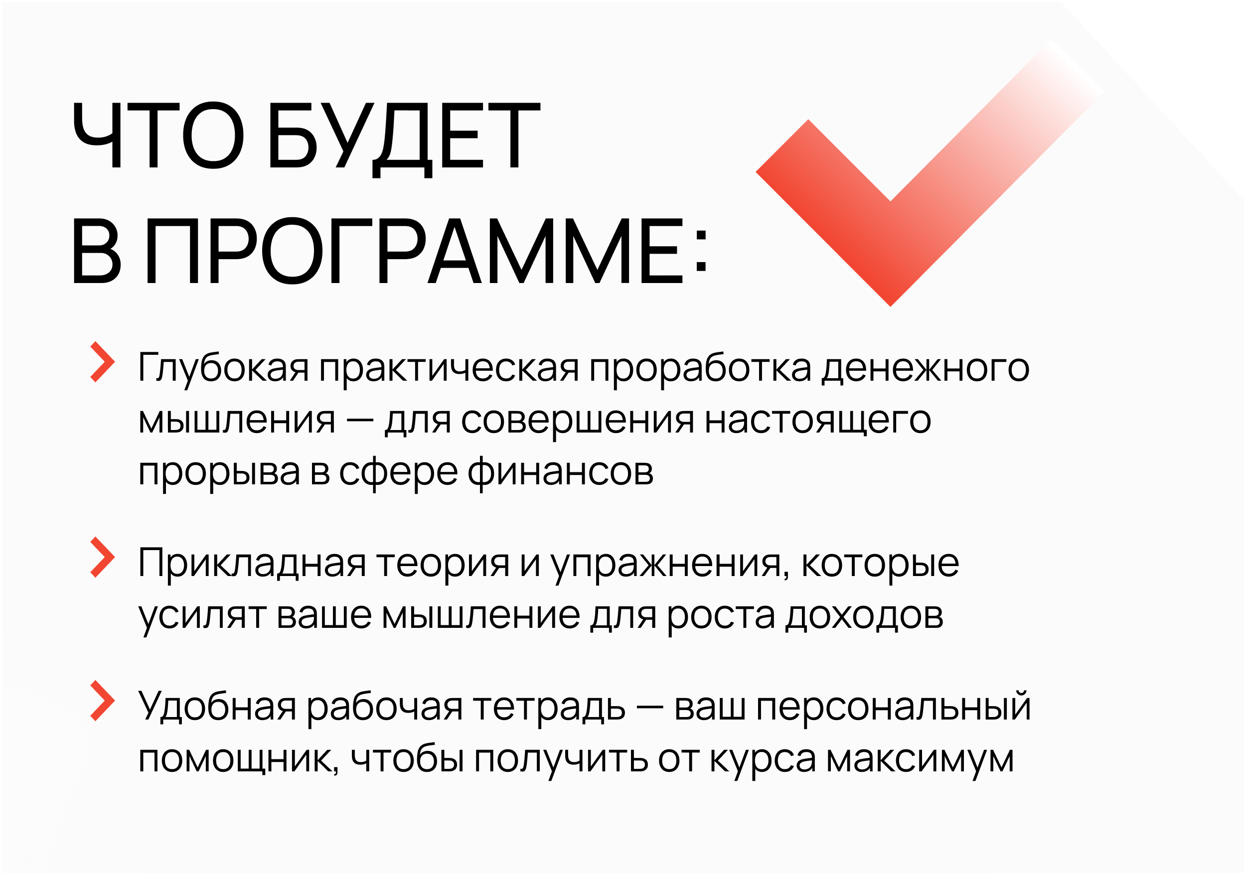 перестроить ваше мышление на восприятие новой финансовой реальности. Поэтому никаких пятиминутных видео и трёх предложений в день! Наше обучение построено на законах нейрофизиологии — мы даем ровно такой объём материалов и практик, который способен эффективно внедрить в жизнь ваш мозг.